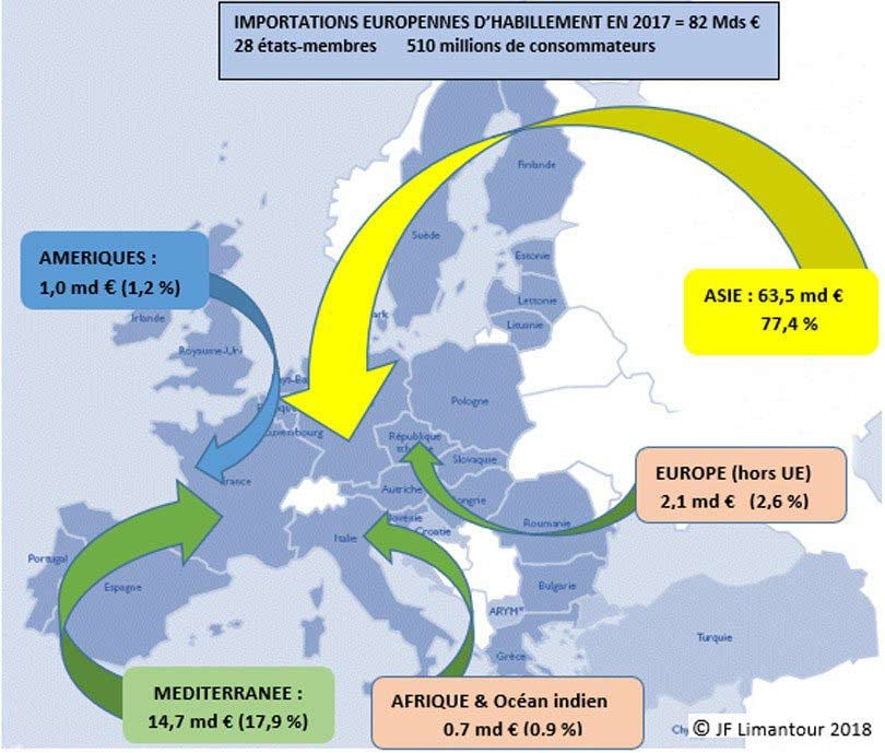 China supplies one third of all EU clothing imports, a 2 percent decrease in comparison with 2017. However, China’s clothing and textiles sector is not in decline, quite the opposite: it is reinforcing its control of the international market both in the industrial and commercial domains. The Chinese strategy consists of moving a portion of its production to low-cost countries which have preferential customs agreements with the EU: Vietnam, Cambodia, Myanmar, Bangladesh,Ethiopia, Egypt etc.
