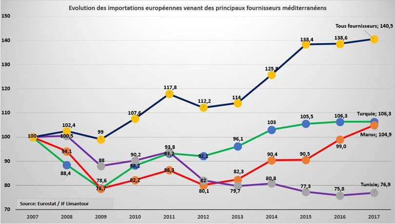 Let’s look more closely at the case of Turkey, Morocco and Tunisia.Turkey is the 3rd largest clothing supplier to the European Union after China and Bangladesh, and has seen its share in European imports fall from 15.3 percent in 2007 to 11.5 percent in 2017. Turkey’s decline, apparent since 2015, is due to a loss of competition caused by a substantial increase in costs. This situation had led to strained relations with the EU, particularly with Germany, which is Turkey's main European client. But because of its customs union with the EU and the strong depreciation of the Turkish Lira, it remains a very interesting country as a clothing source for Europeans. It is the 2nd supplier to the EU in jeans, T-shirts, skirts and men’s jackets; the 3rd in trousers, pullovers, shirts and blouses. However, it is less popular in terms of lingerie, swimwear and professional clothing.