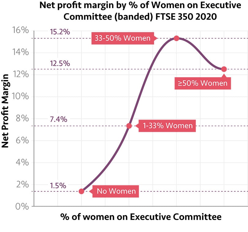 Across all the FTSE 350 companies which have executive committees with female memberships of more than 33 percent those businesses have a net profit margin over 10 times greater than those companies with no women at this level.