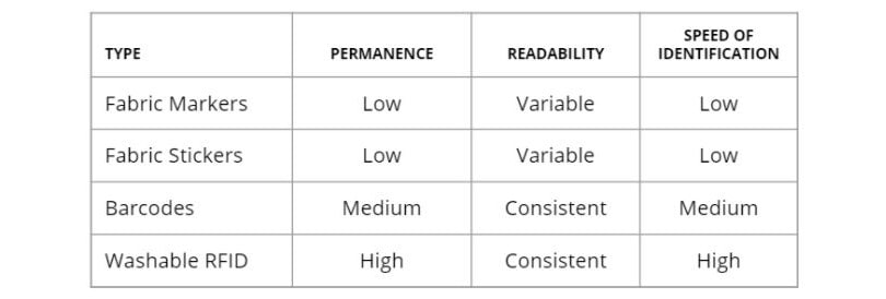 As shown in the table, fabric stickers and markers are less than ideal across the board, though they are cheaper solutions and can be faster to market. As CaaStle reports, having manually written markings or stickers are much more susceptible to fading or coming off in the wash. Barcodes and washable RFID are much more consistently readable and don’t fade, yet it is also important to make sure the digital trigger is woven or sewn in a consistent place on the garments to avoid warehouse workers constantly searching for the tag and slowing the efficiency of the process. With higher scanning identification speeds on top of all of that, washable RFID holds strong potential, and CaaStle and many other leading solution providers anticipate shifting towards this solution, once the technology develops further in terms of, for instance, the error rate when scanning garments at certain proximities.