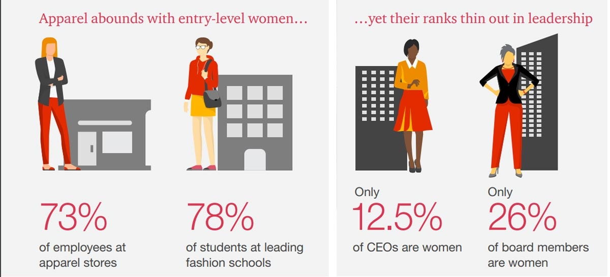 Almost 80 percent of students at the world’s leading fashion schools are women. At apparel stores, nearly 75 percent of the workforce is female and they’re usually serving female customers, as women make about 80 percent of fashion-related purchasing decisions. Yet, only 12.5 percent of the apparel companies on the Fortune 1000 list are led by women. Fashion surprisingly performs worse than sectors which tend to be deemed more masculine, such as the aerospace and defense industries, where 20 percent of C-suite roles are occupied by women.