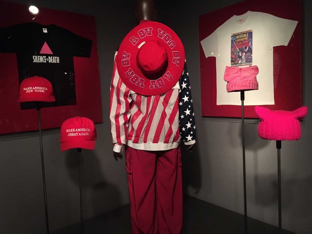 Divided into five sections, “Military,” “Suits,” “Status,” “Sex,” and “Resistance,” the exhibit reflects gender and class struggles, status symbols, war, and shifting cultural dynamics, cleverly underscoring the point that power is subjective, slippery. An anonymous-looking hoodie after the shooting of Trayvon Martin came to be viewed as threatening by some while symbolizing defiance for others. Trump’s “Make America Great Again” red baseball cap sits alongside a similar one from Public School with the slogan “Make America New York Again.” A pair of opulent 17th century aristocrat’s shoes are juxtaposed with Gucci loafers adorned with double Gs. Cultural appropriation rears its head with an oversized gold-plated Chanel chain from the house’s 1991’s “Hip-hop” collection while Gianni Versace’s 1992 “Bondage” runway dresses are evaluated next to actual fetish ensembles from the 70s.