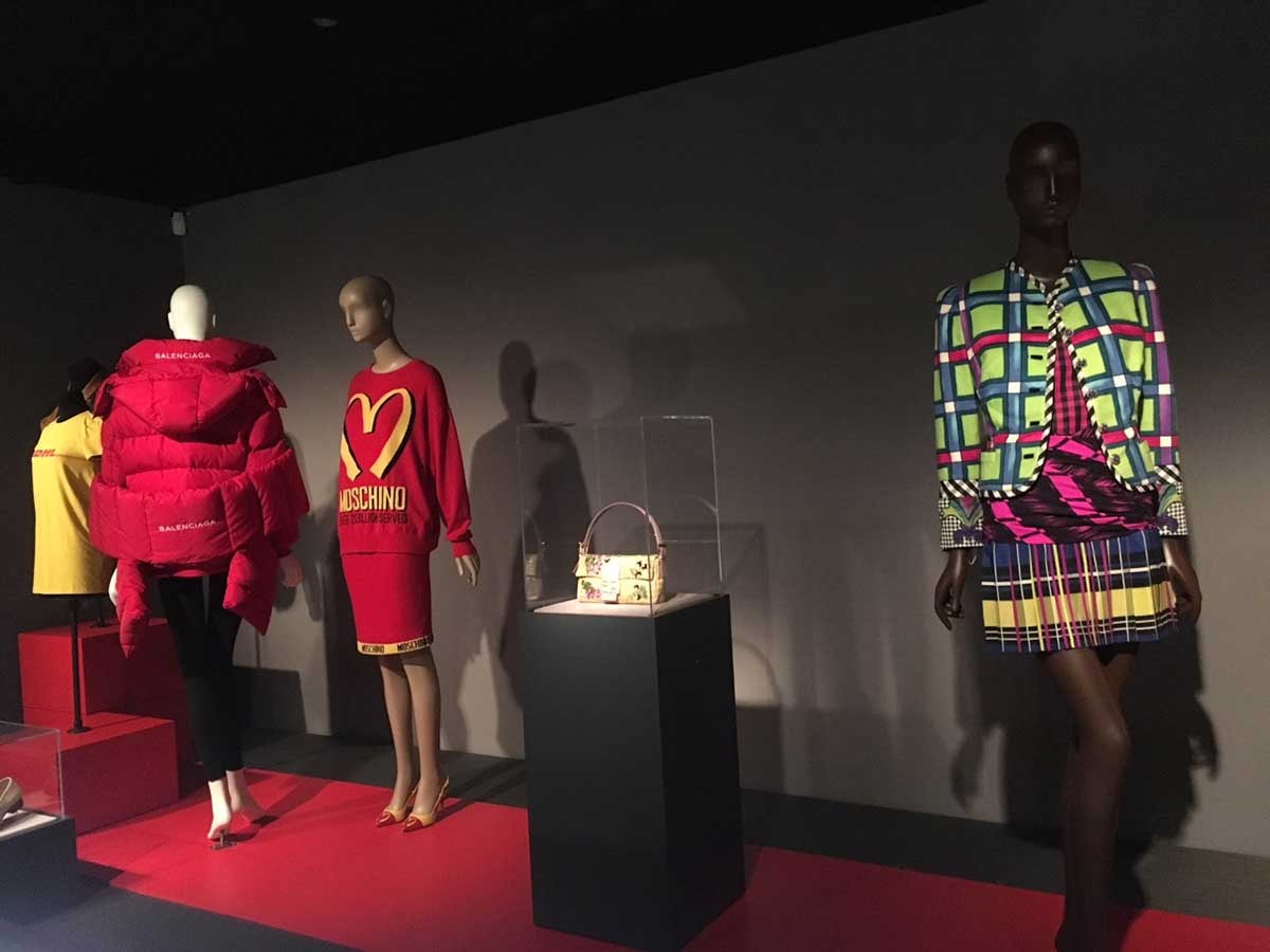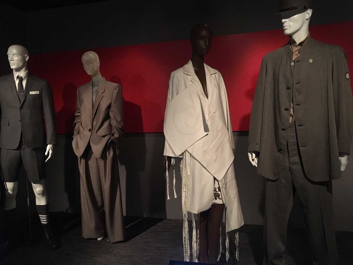 Throughout the gallery items from the early 1700s are pleasingly juxtaposed with vintage pieces from among others Yves Saint Laurent, Thierry Mugler, Adrian, Giorgio Armani, Christian Dior, Jean Paul Gaultier, Azzedine Alaia, Carolina Herrera, Seditionaries, while more recent examples include Wales Bonner, Thom Browne, Gucci by Alessandro Michele, Hood By Air by Shane Oliver, Balenciaga by Demna Gvasalia, Moschino, Marc Jacobs, Givenchy by Ricardo Tisci, Pyér Moss by Kerby Jean–Raymond, Off-White by Virgil Abloh, and Dior by Maria Grazie Chiuri.