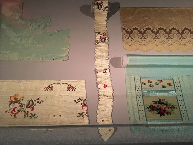 The exhibit is divided into four sections: silk, cotton, wool and synthetics. It begins by tracing the history of silk which for centuries was considered the height of luxury, originating 7000 years ago in the Old World, and arriving in the West via a route known as the Silk Road. Chinese brocades, satins, velvets and damasks were highly coveted in Europe until France and Italy grew capable of creating their own silk manufacture in the 18th century.