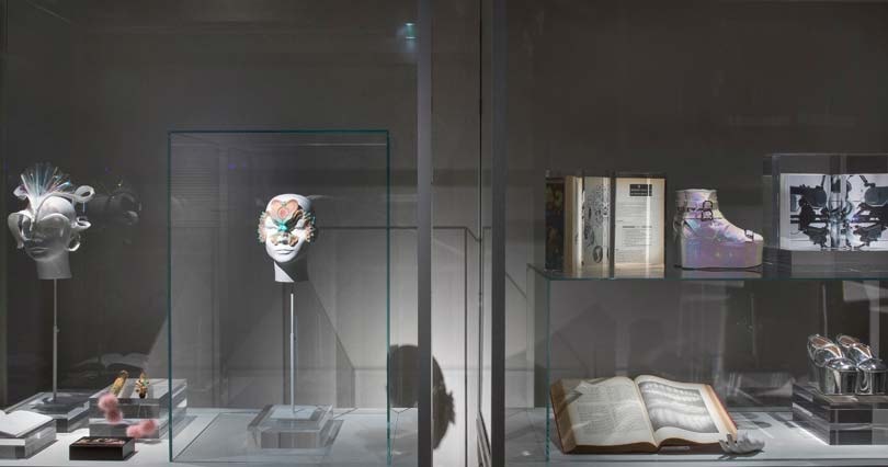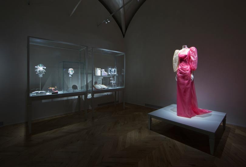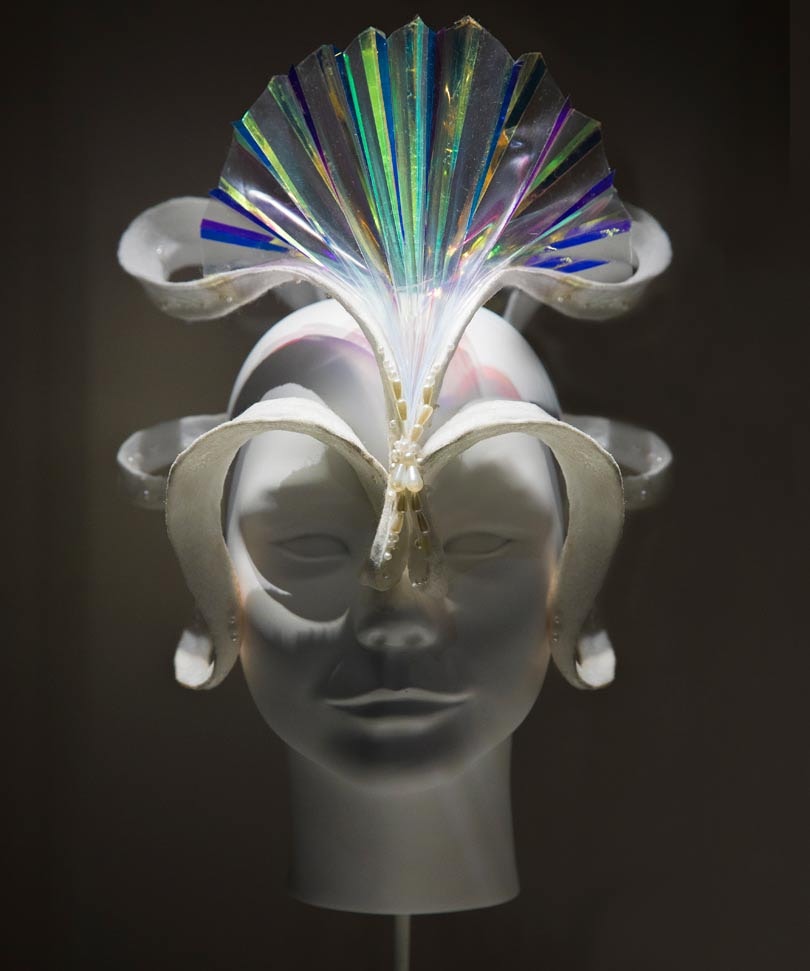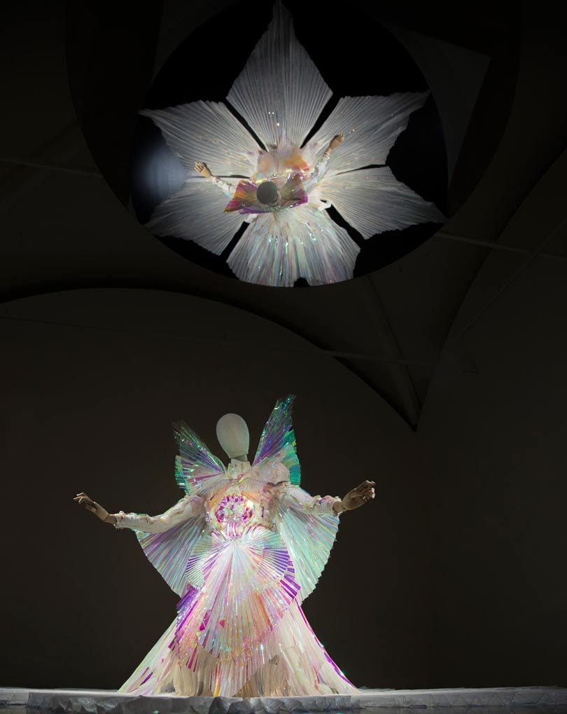 Highlights include the gowns and masks worn in The Gate music video, including the focal “hero” dress of the video, which took 550 hours to make and 320 hours to embroider. The gown combines five metres of finely pleated iridescent PVC and 20 metres of pleated lurex organza, crêpe de chine and silk jersey.