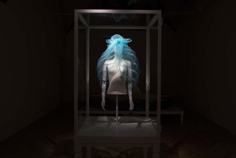 A second gown is on show, as is an array of accessories, and two face masks created by artist and embroiderer James Merry, all of which also appear in the video. In addition, there is also a selection of precious books that are connected to the imaginary world triggered by the film and the creation of the gown.