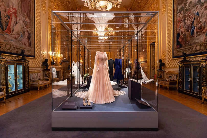 As well as the bride’s ceremony wedding gown, the exhibition also includes the blush coloured evening gown worn by Princess Eugenie designed by American designer Zac Posen, who took inspiration from the “beauty of Windsor Castle and the surrounding countryside”. The gown is made of British silk chiffon and incorporates a cape, subtly embroidered with the White Rose of York, and gathers at the lower back and draping into a softly pleated full-length train.