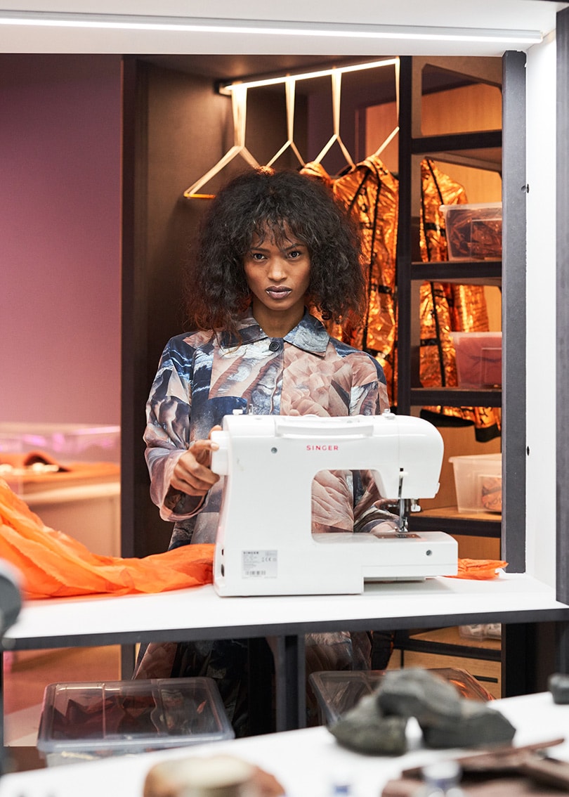 These pieces are displayed in the full-scale Mars habitat, designed by London-based architecture firm Hassell as part of NASA’s 3D-Printed Habitat Challenge, which will allow visitors to walk around, sit on the 3D printed furniture, as well as try on the Raeburn designed clothing using material designed by NASA for space exploration and engineered for temperature regulation on earth, in space and on the red planet.
