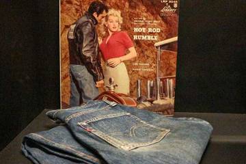 There are also a number of pieces from Levi’s archive including a customised pair of Levi’s 505 jeans with colourful patches and trimmings, paired with an Ossie Clark shirt, to highlight hippie-style fashion. In addition, there is a pair of bell-bottom Orange tab jeans, a pair of super slim jeans and a men’s leather jacket.
