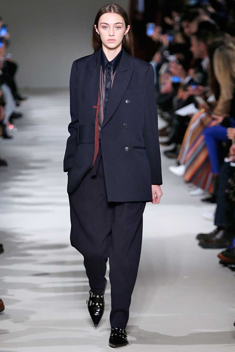 The 1940s were revolutionary in fashion as women for the first time began embracing a more practical wardrobe, which saw reductions in fabric and the knee-length dress replace the longer gown. The emphasis was on the waist, which is precisely what we saw for AW17. Dresses worn just over the knee had detailed bodices but avoided superfluous pockets, sleeve lengths or over-detailing. The shoulder is still strong with belts cinching the waist. Lanvin had some of the best dresses around for this look.