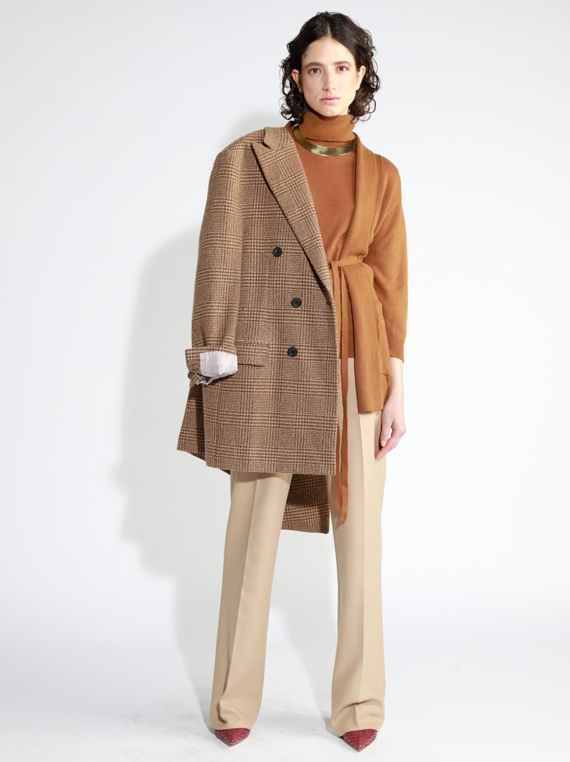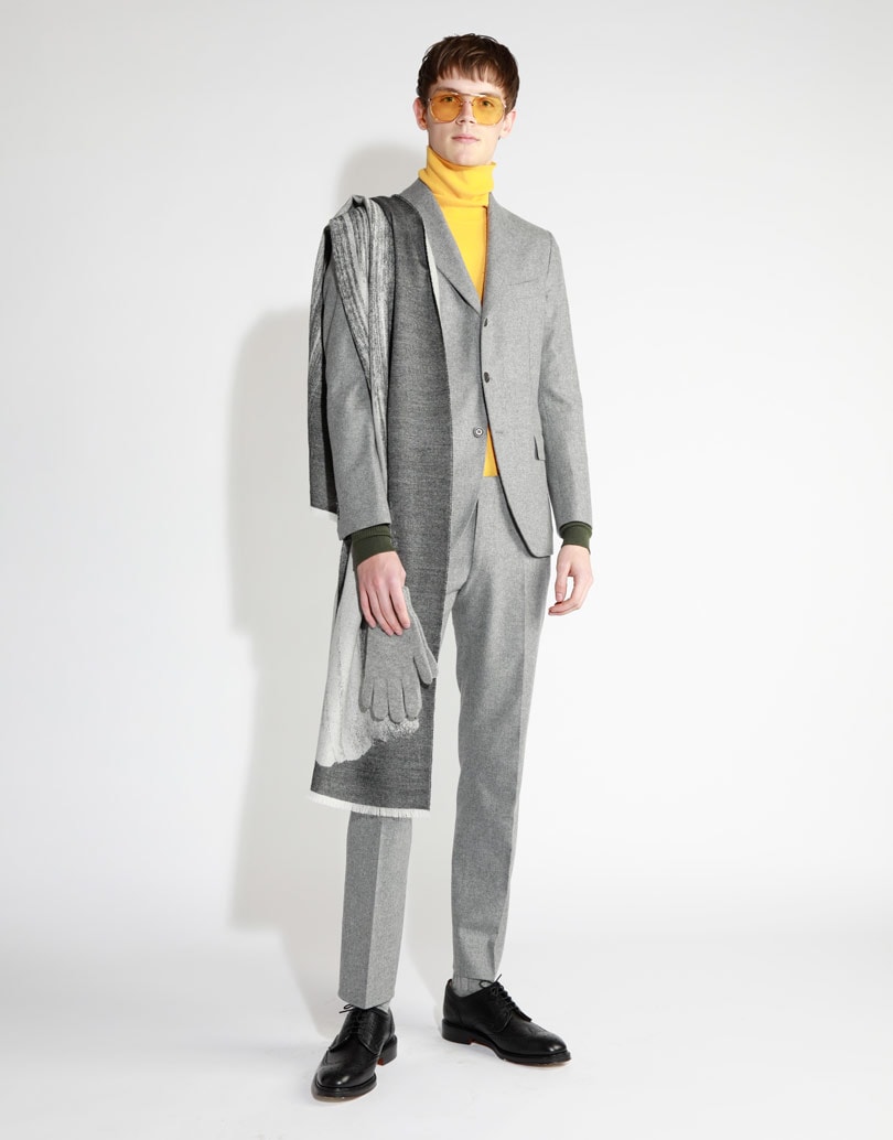 The women’s collection offered sculptural and ethereal themes, with linear silhouettes in matte double-face cashmere in black, natural and camel, alongside elegant tailoring, and super soft cashmere statement pieces with exaggerated textures, in neutral tones with flashes of bold colour. Highlights included a double-faced wool and cashmere peacoat paired with a yellow rollneck, grey cashmere joggers and a red tartan scarf, and an electric blue collarless coat.