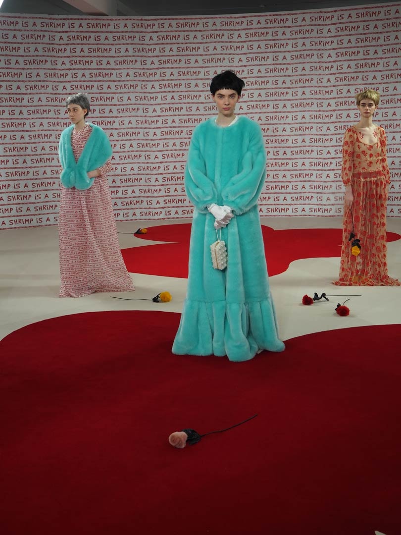 Shrimps ‘The Romance Collection’A rising star from the NewGen initiative has to be designer Hannah Weiland’s label Shrimps. For autumn/winter 2018, Weiland has been inspired by Parisian art patron, Gertrude Stein, looking at her muses, art collection and language. As Stein famously said: “A rose is a rose is a rose is a rose”, for AW18, Weiland states: “A Shrimp is a Shrimp is a Shrimp is a Shrimp”.