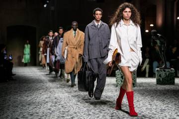 At Max Mara, the focus was not only on the famous camel-coloured coat, but also on the woman wearing it. In search of modernity, Max Mara designer Ian Griffiths travelled to the 18th century and was inspired by the French philosopher Émilie du Châtelet, Max Mara said on Monday. The resulting "Camelocracy" collection consisted mainly of knitwear in warm hues. The historical references could be discovered above all in the styling. Elbow-length gloves - both knitted and leather - met a shoulder strap incorporated into dresses, which Griffiths said was a “styling trick” of soldiers in the military. After the autumn/winter 2023 show, the designer told British newspaper The Guardian that his collection "showcases the beauty of the wearer and is designed with the comfort and convenience of the wearer in mind".