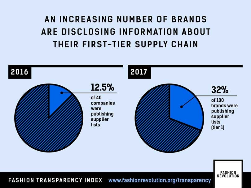 Overall fashion brands show a 5 percent improvement in transparency levels across each area of the Index’s methodology, which underlines how the Index, as well as other movements and initiatives, are encouraging brands to become more transparent. The three fashion brands which improved their levels of disclosure over the last year are The North Face, Timberland, and Wrangler who increased their transparency by 22 percent overall. An increasing number of brands, including Primark and Asos, publicly shared their factory suppliers were their products are cut, sewn and finished, up from 12.5 percent two years ago to 37 percent in 2018, representing one of the most significant and positive boosts in transparency. More brands also published a list of their processing facilities, 18 percent in 2018 up from 14 percent in 2017.