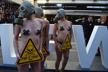 People for the Ethical Treatment of Animals (PETA) staged a protest at Brewer Street Car Park, on Friday morning during the opening of London Fashion Week during which models donned gasmasks to remind attendees of the toxic and potentially carcinogenic chemicals used in fur manufacturing.