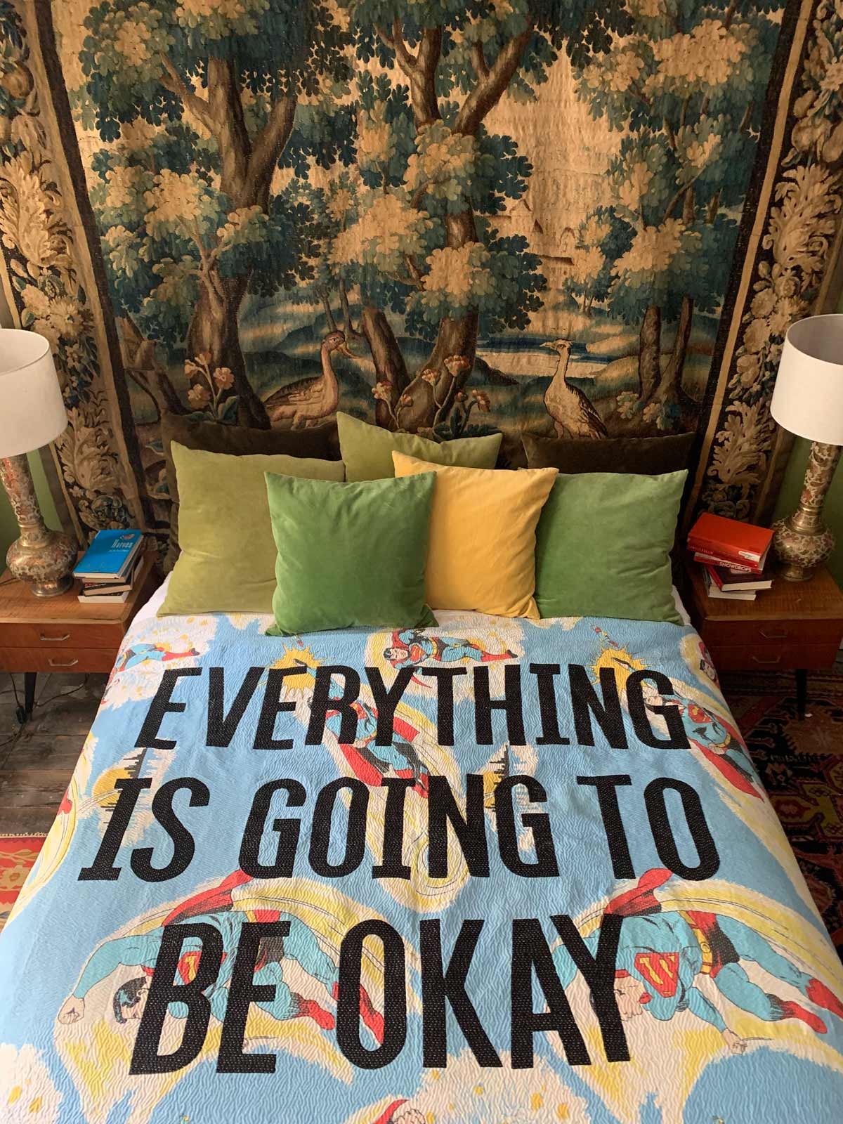 'The Delights of Lovers’ collection celebrates intimacy, humour and sex, with each of the one-of-a-kind blankets featuring graphics, patterns and poetry written by Gupta. Motifs include comic-book heroes and Disney princesses alongside erotic slogans and spiritual affirmations.