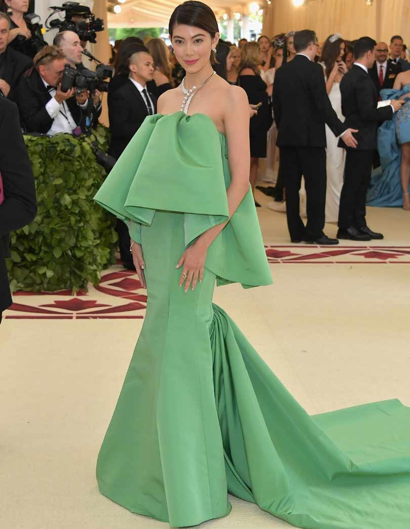 Gurung also showcased three colour blocked gowns, a bright yellow plunging neckline racerback dress as worm by Gabrielle Union, which was created to symbolise the brand’s “we are stronger in colour” ethos, a strapless flounce top mermaid gown, seen in eden green at the Met Gala, it will also be available in rose and black, while Ming Xi’s pink gown will set you back 17,495 dollars.