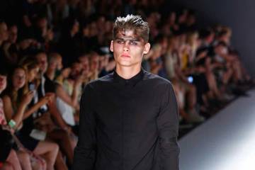 The catwalk was officially opened with the runway show from menswear label So Popular on Tuesday morning, marking the start of Mercedes-Benz Fashion Week in Berlin. During the high summer temperatures, Daniel Blechmann shows his collection named 'The Last March before Victory' in a tent at the Brandenburg Gate. The designer tapped RJ Mitte, best known for his role as Walter White Jr. on Breaking Bad as one of the models.