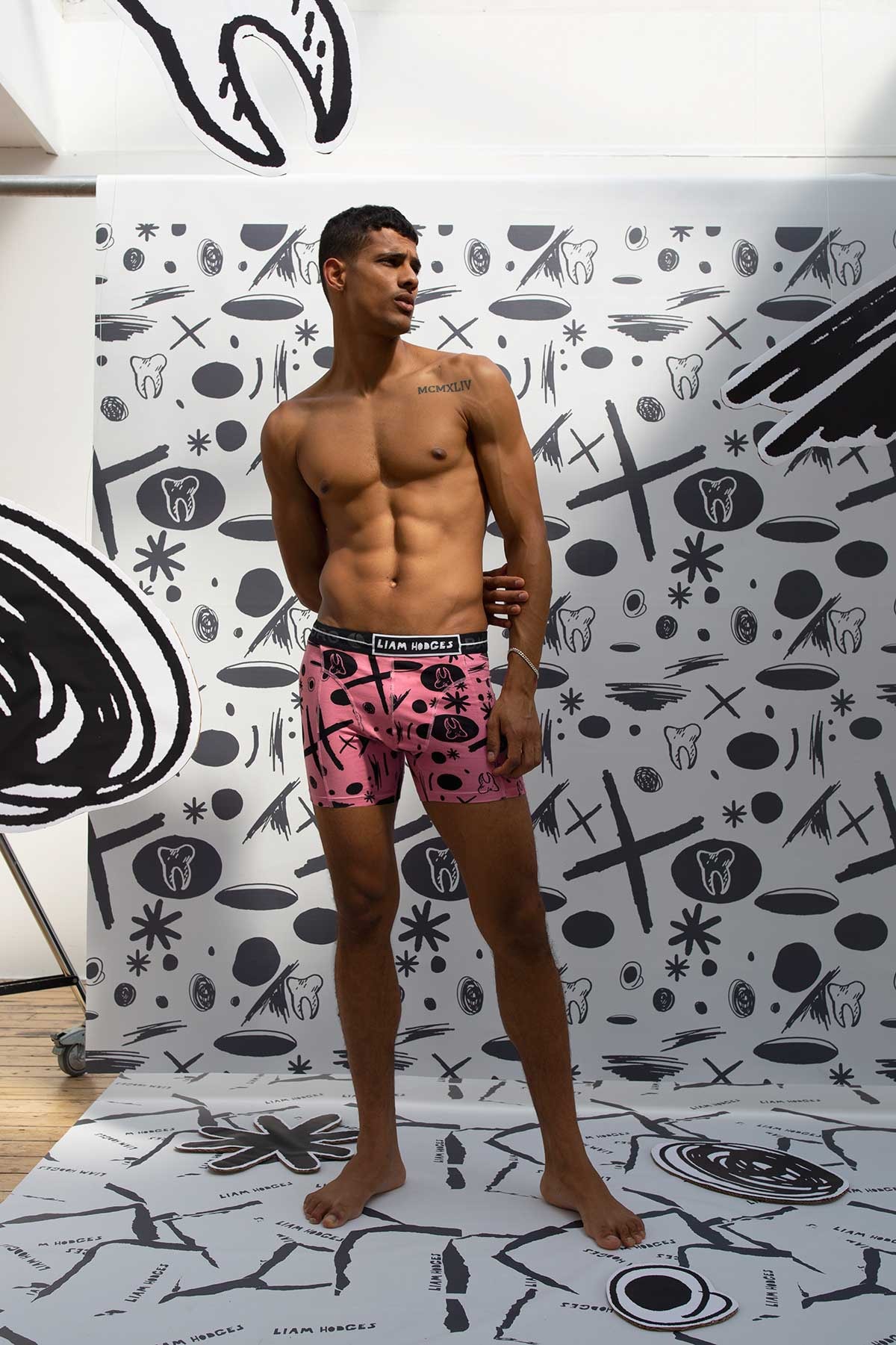 A highlight of the underwear collection is the ‘Scribbler’ print shorts in wild rose that feature hand-drawn illustrations of teeth, crosses, stars and ink blobs, with a Liam Hodges, branded waistband design.