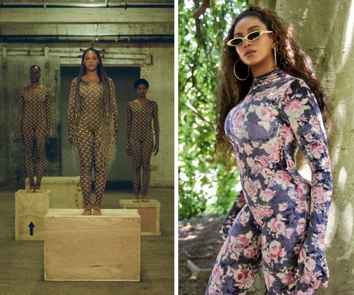 Catsuits and bodysuits featured extensively in the film through glittered, textured and printed designs, such as Marine Serre whose crescent moon bodysuit achieved cult status after its notable appearance on Beyoncé and her backup dancers. S.Garvey and D.Bleu.Dazzled also contributed to some of the many catsuits worn by Beyoncé, appearing in the clips ‘Already’ and ‘Find Your Way Back’.