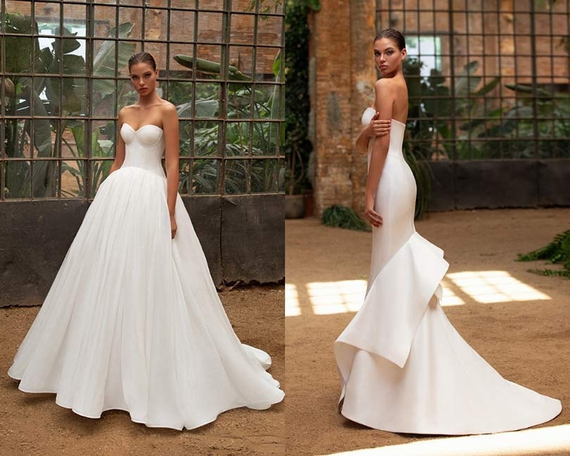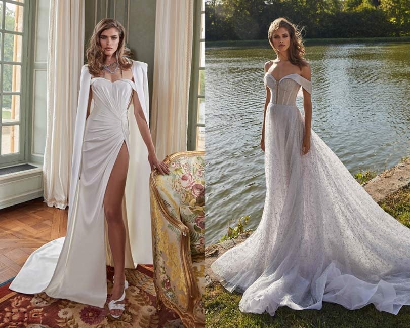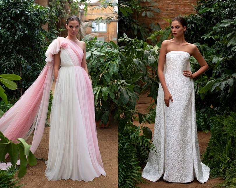 Standout looks: ‘Meghan’ is a strapless ballgown with a voluminous coat with balloon sleeves and an oversized statement bow, ’Anna’ is a silk satin column gown with thigh-high slit and off-the-shoulder straps and shown with silk satin cape, and ‘Aretha’ a stunning lilac and silver A-line wedding dress with plunging corset, off-the-shoulder tailored collar-style neckline, and pleated tulle and organza skirt.