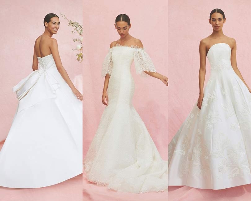 Classic was one of the hot trends from Bridal Fashion Week and Carolina Herrera showcased a beautiful array of traditional silhouettes, from strapless a-line gowns to ballgowns with each featuring subtle detailing to make them stand out. One dress had an exposed crystal embroidered corset and cascade draped back bow, while others featured cream floral threadwork embroidery against ivory satin, and another was a strapless trumpet gown with organza floral lace and detachable sleeves.