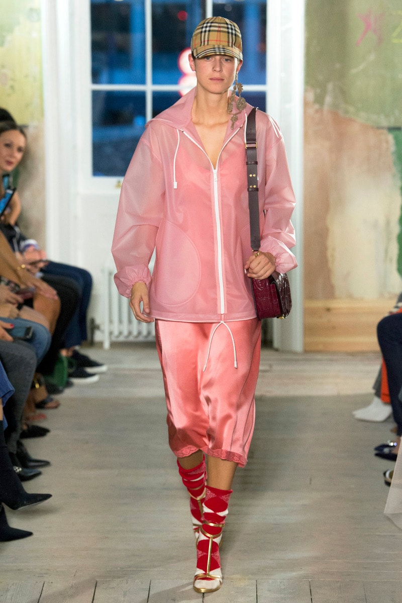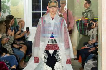 One look comprised of a soft-touch plastic anorak worn against the bare skin under a laid-back soft camel leather jacket and accessorised with gold sandals. Another saw the same supple plastic anorak layered over a heavy-wool tartan skirt. Flowy bohemian dresses were dwarfed under clashing tartan trench coats in another one. Bailey also used English lace to craft long, sensual skirts, yet also tapped into streetwear with baseball caps -- although there was no mistaking Burberry's emblematic tartan.