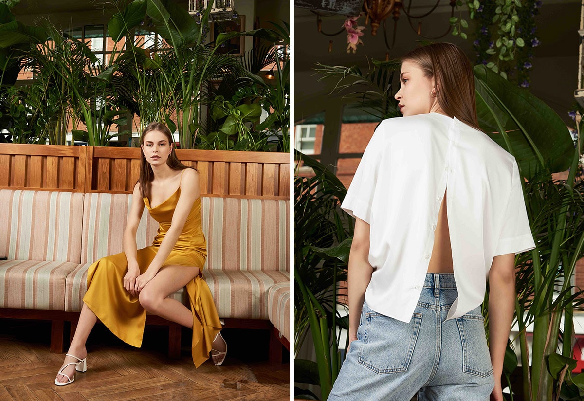 I love the classic combination of one of our organic bamboo silk button-down shirts, recycled denim jeans, and a pair of vegan leather mules. Also, anything vintage, rented, or second hand in the mix is the way to go!