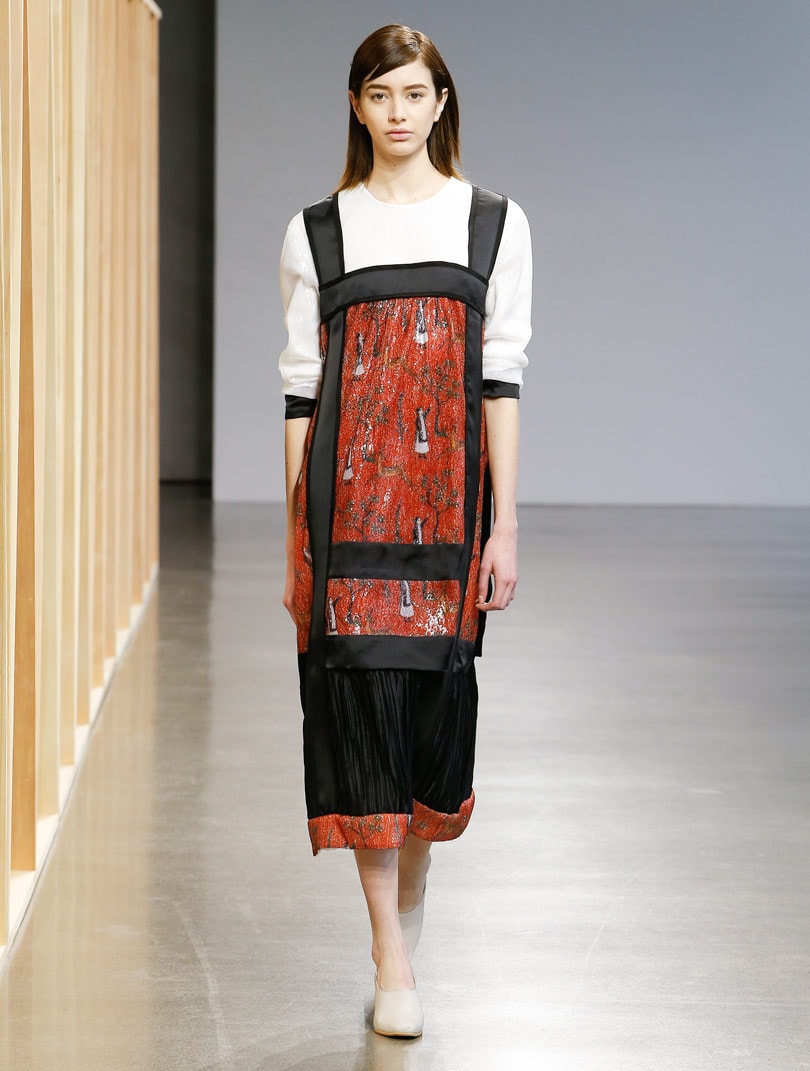 Coats, tops and dresses were featured in houndstooth wool, jacquards and woodland scene patterns. Elements of nature played a big part in patterns like floral patterns, peacocks and a pattern of a woman at a tree. Other details included double pleated skirts with metallic weaves. There was a lot of shimmer here to add to the whimsical elements of the collection.