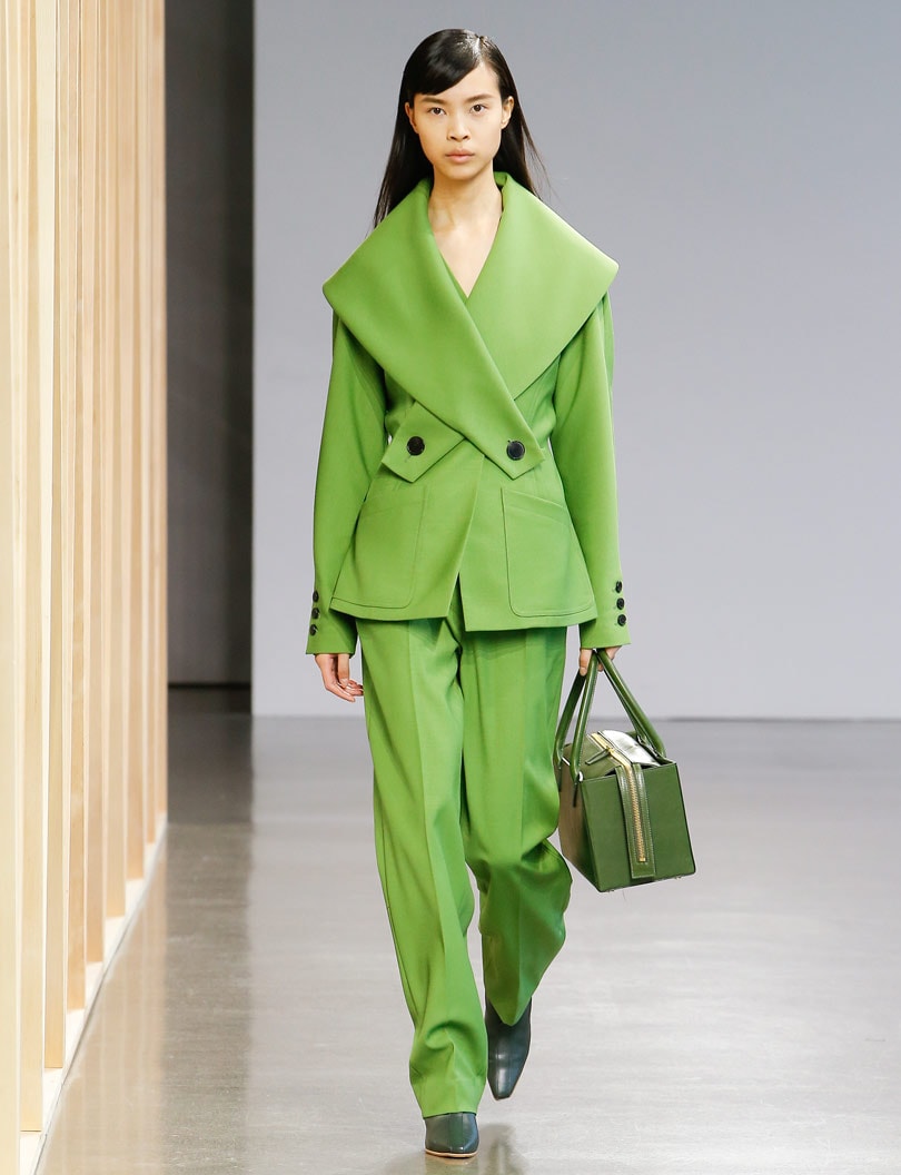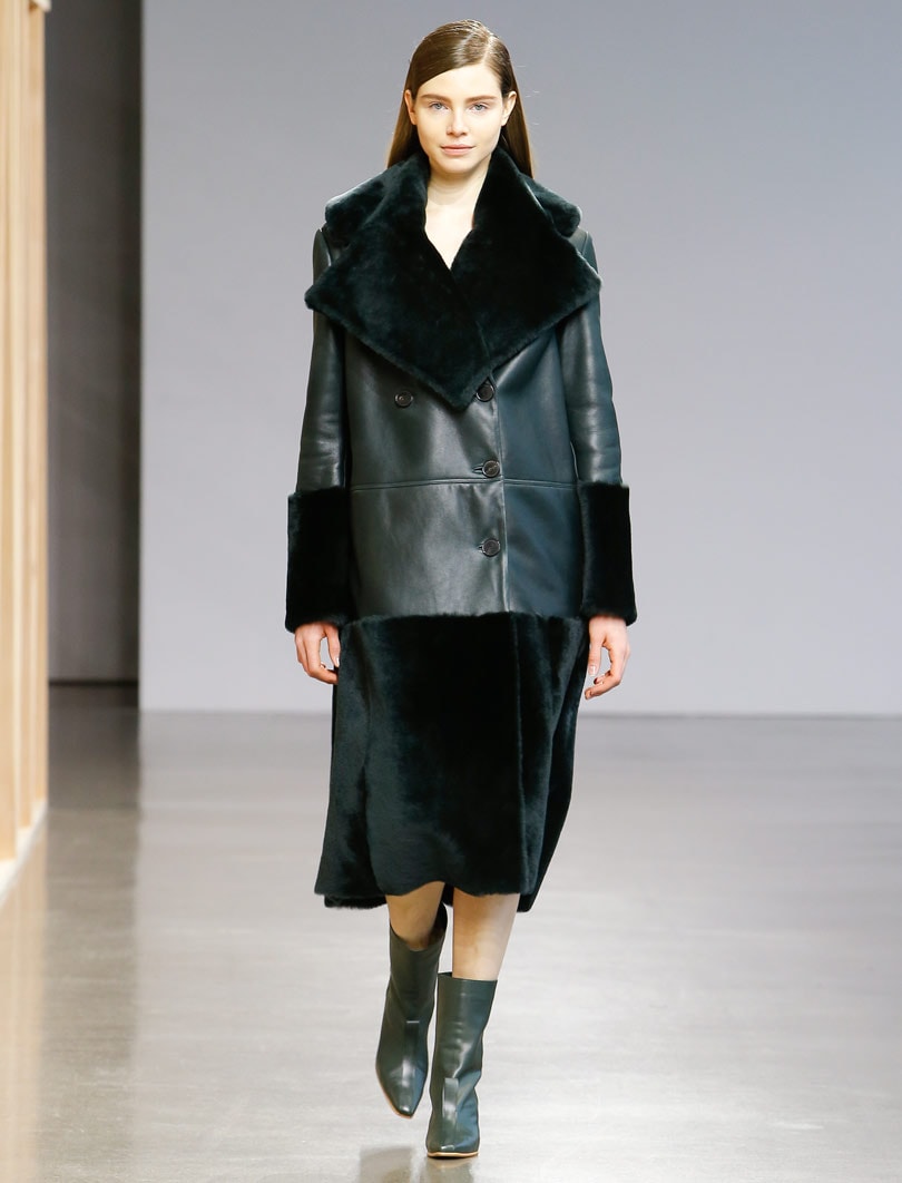This season, Claudia Li also introduced two new shoe styles for fall including a bootie and a pump featuring the designer's signature oversized tab. The 'Kete' bag from spring/summer has also been reinvented, featuring a solid leather rectangular shape available in black and forest green as well as larger style with Mongolian curly shearling trim.