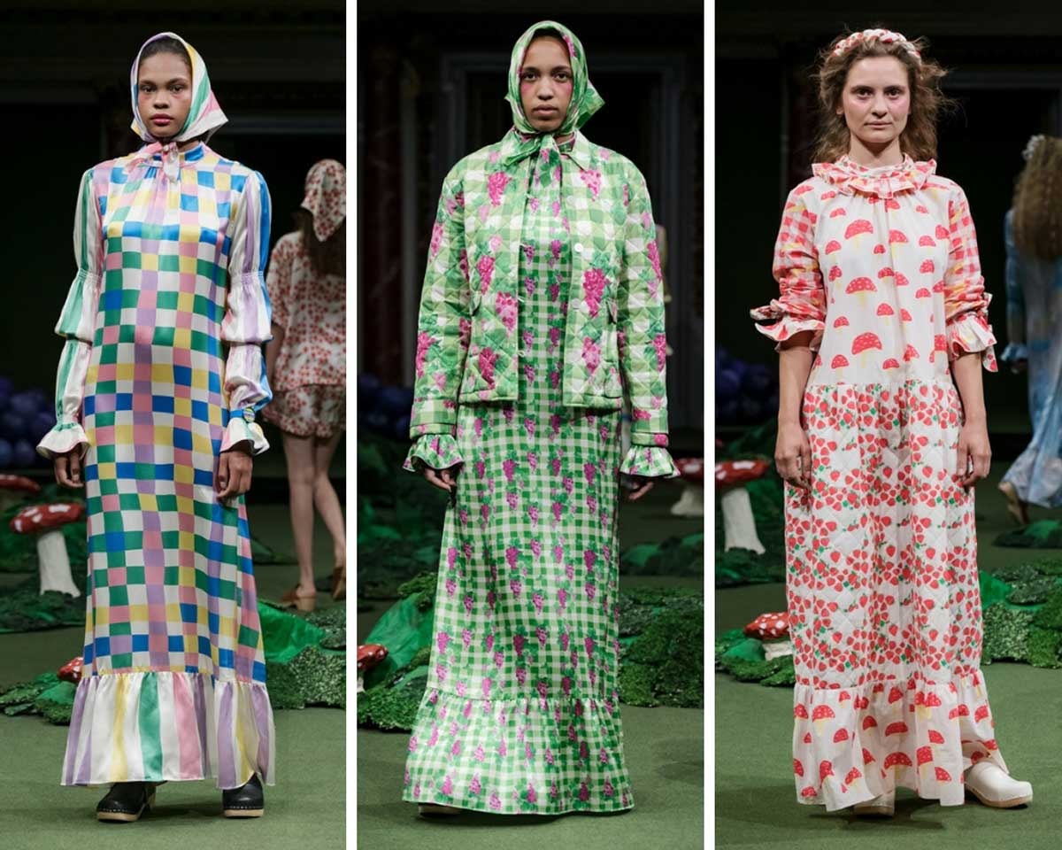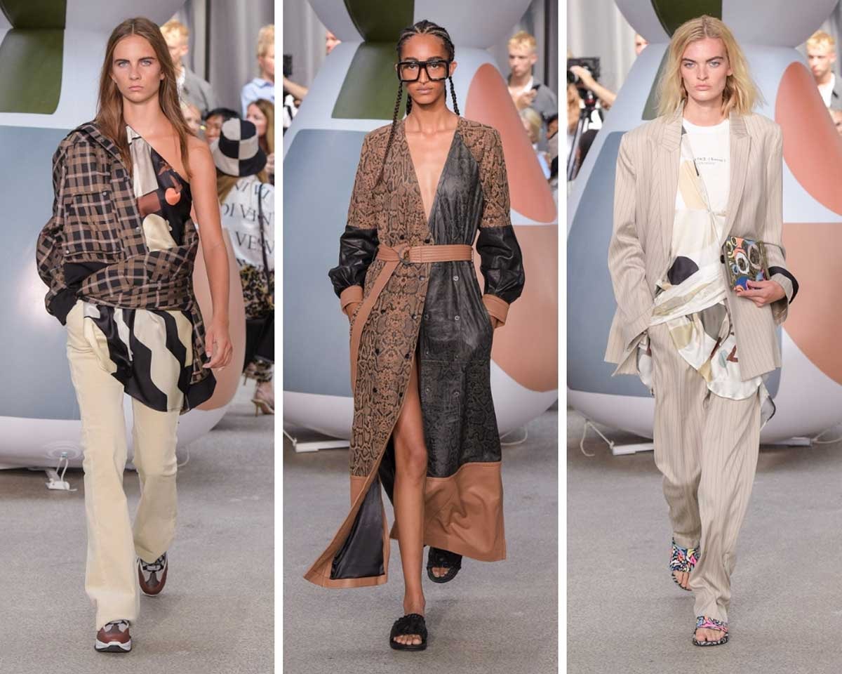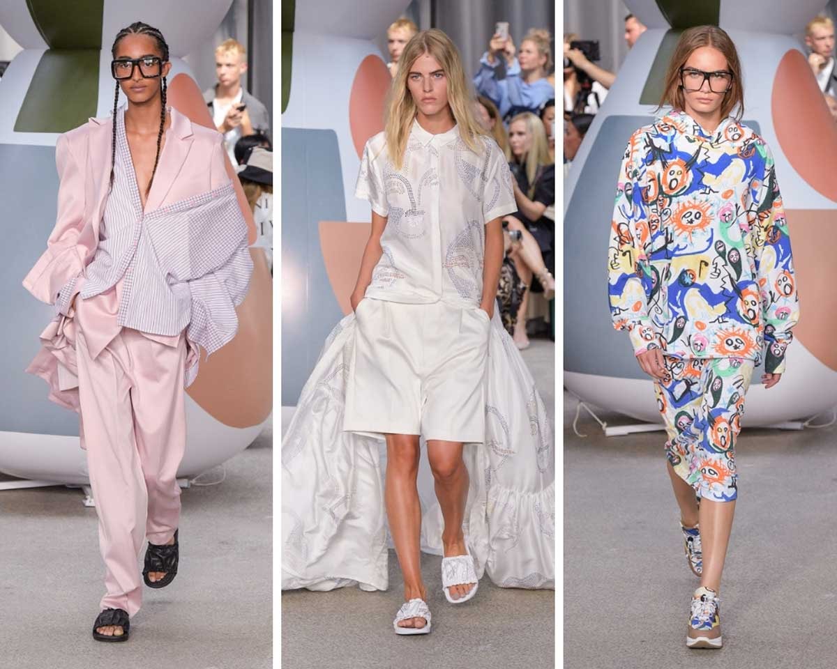 For spring/summer 2020, Scandinavian brands rebelled against the minimalist aesthetic, which they have been championing in recent years, instead they opted for colour galore, with bursts of pastel lilac, green and pinks, as seen at Ganni, Elaine Hersby and Stand, while print clashes were a big trend for Saks Potts, Ganni and Munthe from floral with paisley prints to checks with pinstripes, while Henrik Vibskov paired prints of lobsters, sardines and dancing couples for a cartoon-like feel.