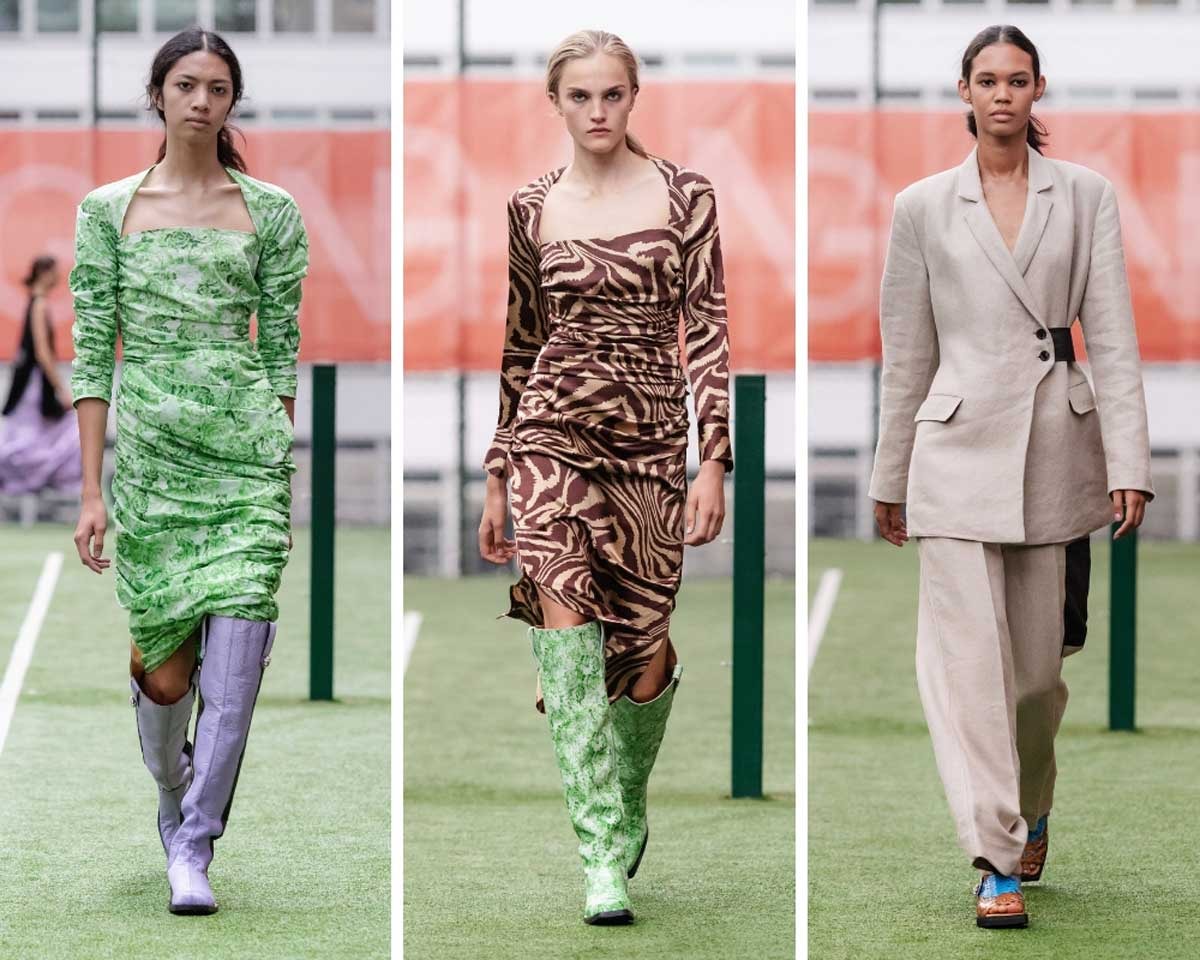 There are also variations on Ganni’s signature wrap printed dress, with square necklines, three-quarter sleeves and ruching detail down the entire body with cut-outs and a new piercing-like pin detail, which were showcased in a lilac-and-white rose motif, a posy-printed mint-green satin and an animal print.