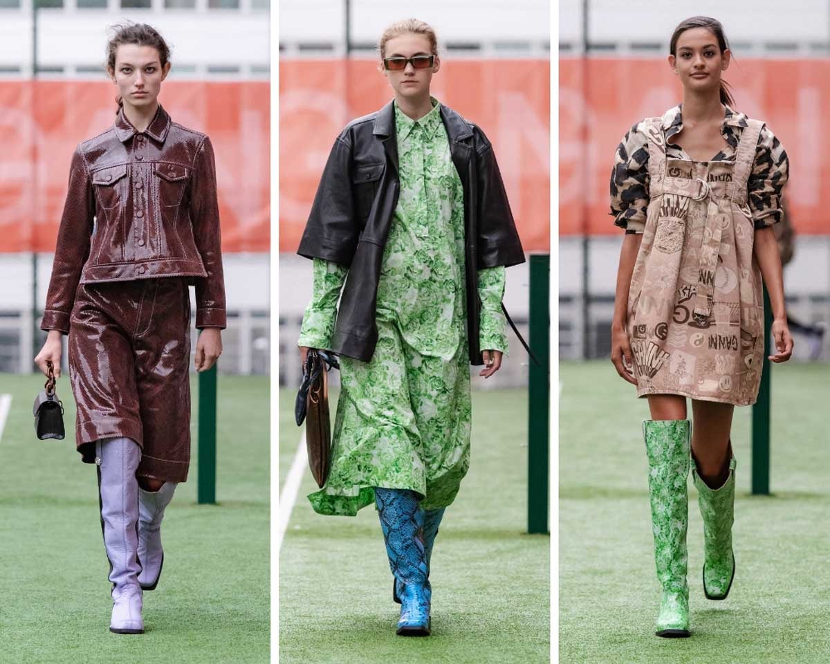 Leather also made a statement, not thought as the key fabrication for a spring/summer wardrobe, but brands including Ganni and Stand highlighted the beauty of summertime leather with Stand presenting a purple snakeskin-effect leather jacket and skirt ensemble.