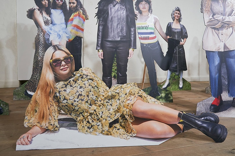 An immersive 5-piece multimedia event replaced Ganni’s usual runway format. A collection video was accompanied by a Ganni KIOSK of upcycled merchandise and a rentable collection produced in collaboration with Levi’s. In an exhibition space, artist Rosie Marks created cardboard cutouts of the label’s influencer fans whilst Hayley Blomquist contributed a knitted installation featuring repurposed denim from both Ganni and Levi’s.