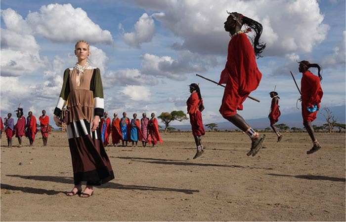 I was struck by the Valentino Spring/Summer 2016 ad campaign, photographed by National Geographic photojournalist Steve McCurry, set among the Maasai of Kenya’s Amboseli National Park. The Valentino team were apparently caught in a dust storm during shooting, but I wondered if a bigger storm wouldn’t descend on them when the campaign gained press. At the eye of that storm? Cultural appropriation.