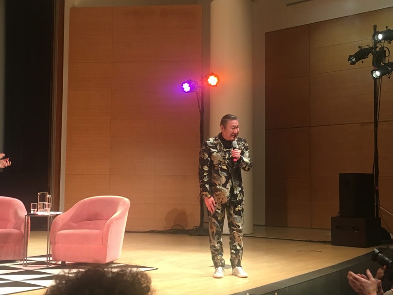 Kansai Yamamoto arrives on stage in the auditorium of the Brooklyn Museum in a shiny black and gold suit, and says he dressed down to blend in with New York City’s minimalists. Otherwise his life is filled with the color––which he likens to oxygen––which brought him to the world’s attention in the 70s as the clothier of David Bowie’s technicolor alter ego, Ziggy Stardust. But the designer is also every bit the performer, playfully responding to questions from the New York Times’s Fashion Director and Chief Fashion Critic, Vanessa Friedman, with a twinkle in his eye, sometimes through his translator, and sometimes confidently, if slightly eccentrically, in English. Friedman doesn’t attempt to rein him in from his many tangents and random anecdotes because the audience is clearly lapping it up.