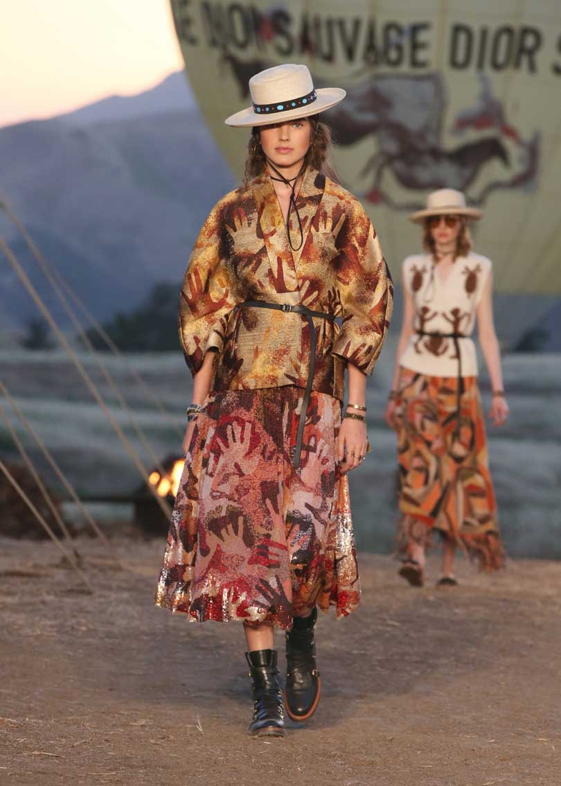 Around 50 models showcased a wardrobe with a music festival vibe inspired by Lascaux cave paintings, painter Georgia O'Keeffe and feminist shamanic healer Vicki Noble, with plenty of pleated skirts and bolero hats on show.