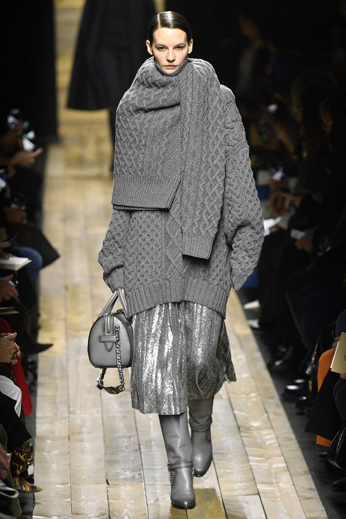 Thick knitted sweaters, cashmere ribbed turtlenecks and herringbone tweed skirts evoked curling up beside a log cabin fire with a mug of hot cocoa.