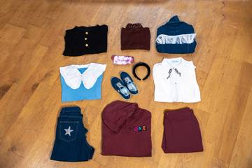 The capsule collection features a turtleneck jumper, button-down shirt, jeans, denim jacket, white canvas trainers, socks, smock-style dress, sweatshirt, joggers, a white T-shirt and a headband. Each piece has been upcycled using techniques, such as dyeing, appliquéing and sewing to extend the garments longevity and give it a new lease of life and colour.