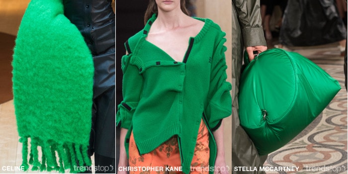 The fluffy blanket accessories that stormed Céline's runway show are the inspiration for the season's vibrant green tones. Knitwear and accessories are emboldened by strong statement shades that contrast with their soft and tactile fabrications. Vivid hues lift a core base of black and khaki and introduce a high-fashion element to the casual and utility a basics.