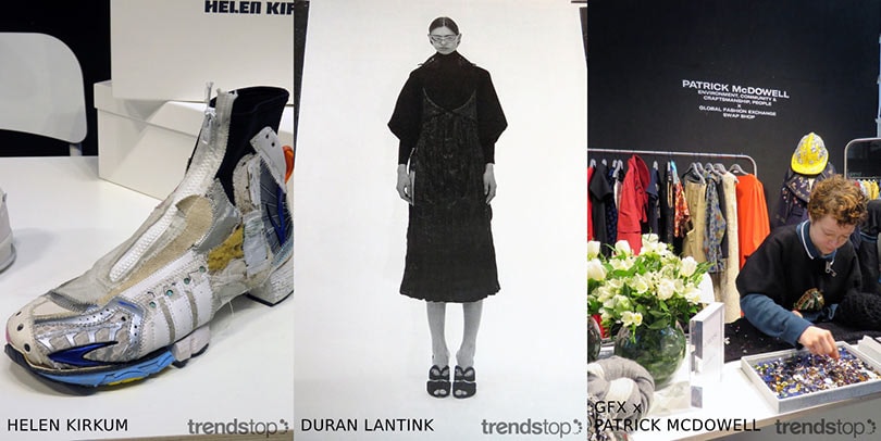 Giving garments a second life and reusing materials rather than producing from new is an industry shift being embraced by many designers and brands. Helen Kirkum creates one-off sneakers from used sneaker components while Duran Lantink took a wry look at repurposing fast fashion garments in his Stolen by Duran display. Having stated that he will not show any new clothes this season, designer Patrick McDowell became the curator and host of a collaborative swap shop concept with the Global Fashion Exchange where visitors could swap their own garments for pre-loved designer pieces donated by designers and celebrities.
