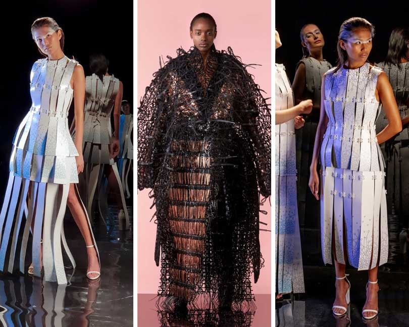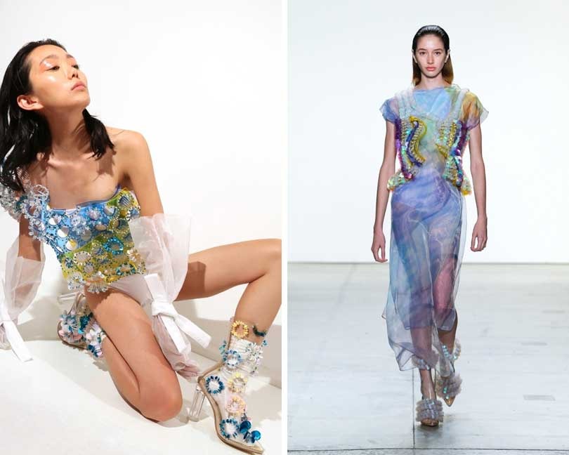 Shie Lyu, with a background in finance and accounting, completed a Fashion Design Masters at Parsons in New York, and went on to show her graduate collection at New York Fashion Week. Lye, originally from China and having lived in Sydney, Tokyo, New York and London, asks herself ‘What can a mathematician innovate in fashion?’ and use precise ‘formulas’ and ‘tools’ to create her new modern and romantic couture collection that uses unusual industrial materials like molded Perspex, rubber, and heat shrink industrial tubing, alongside contrasting colourful embroidery and beading using haute couture techniques.