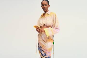Key pieces include a digitally printed spaghetti-strap-waisted cropped shirt and drawstring skirt, as well as a plant-based dyed, caped dress and poncho-style hoodie. A chestnut brown matching top and trouser set were produced through a unique spin dyeing technique.