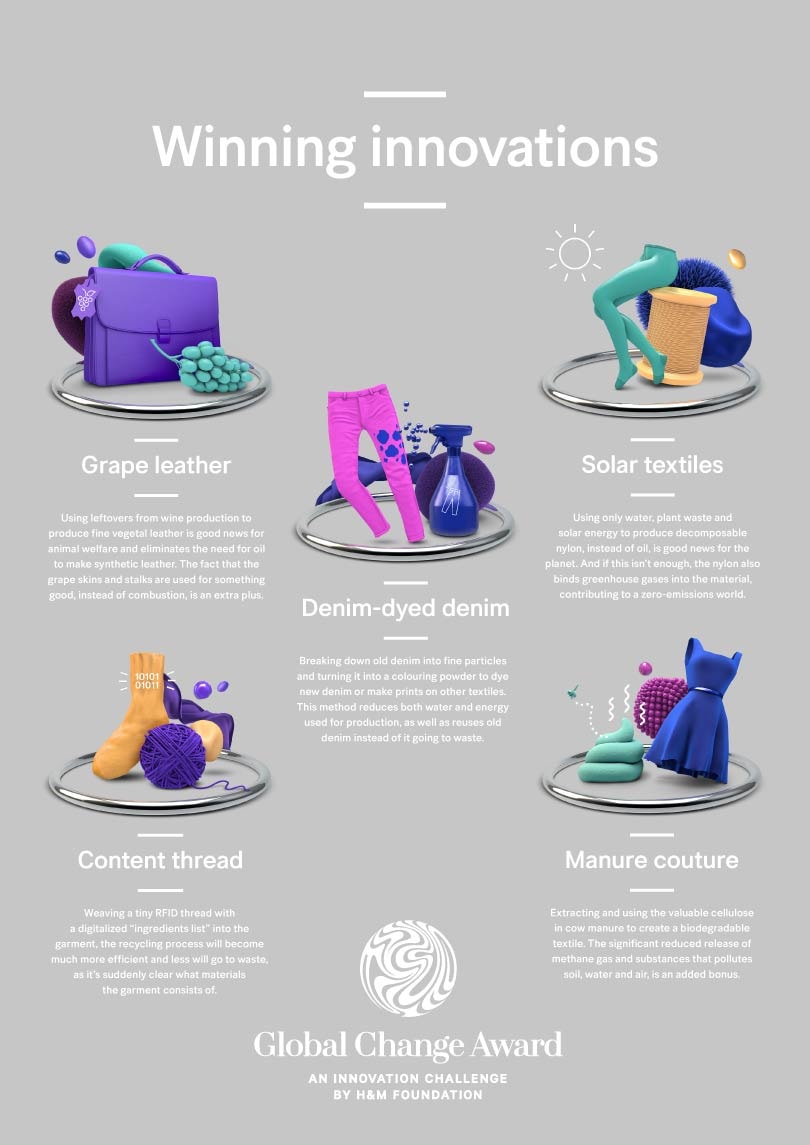 The five winners of H&M 2016 Global Change awards offer a wide range of ideas and include: a digital content thread which facilitates recycling of apparel; a carbon-binding nylon made from biomass and solar energy instead of oil; vegetable leather crafted from wine production waste; used denim used to dye new denim; and transforming cow manure into biodegradable textiles.