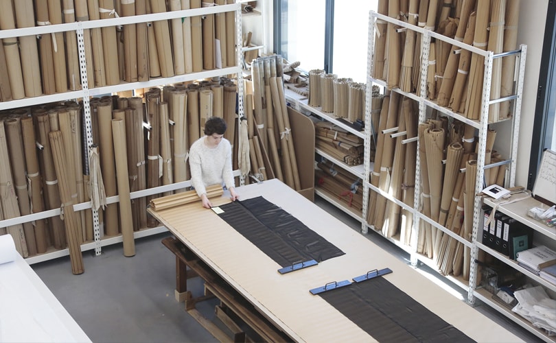 Coated, flat or box pleats, rounded pleats, flexible pleats for draping effects, accordion pleats, Watteau pleats describing a succession of box pleats flared at the bottom, sunburst pleats at very close intervals that expand, Fortuny pleats inspired by Greek woollen tunics, not forgetting cutaway, flower, peacock, pyramid, ribbon and origami pleats, the technique used to create pleats always uses a unique Kraft board mould or pattern (about 3,000 in stock) the oldest of which date back to 1900. The production processes have not changed since the start of the 20th century. Firstly, the fabric is ironed and made flat (silk, crepe, tulle, muslin, organza, velvet, as well as other materials such as leather or polyester), then it is placed parallel to and next to the cardboard mould, rolled up in it then put into an oven at between 85°C and 100°C for a period of between 1 hour and 1 hour 30 minutes depending on the fabric. It is then left for a day to allow the entire mould to cool down so that the fabric can definitively take the form of the pleat, before it is taken out of the mould. And it works like magic!