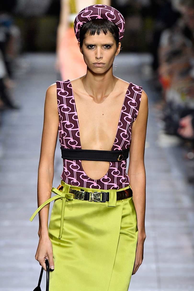 Fendi is still flirting with sportswear after last year's collaboration with Fila, showing off sports bras and cycling shorts, worn under flowing blouses.