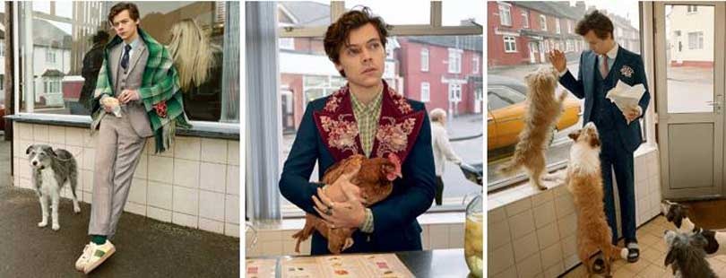The English musician Harry Styles poses in typical British fish and chips shop in Gucci's men's suits campaign. Styles poses in multiple pieces from the newest collection of the Italian luxury brand. Despite the campaign’s star-powers, it is mainly the animals that steal the show. Commenting on that, Gucci said in a press release from June, "Styles brings his pets, a dog and chicken, along to the restaurant, where he ordered his food and shares with the animals. A series of stories that reflects famous photographs and scenes from British films, "The Fashion House.”