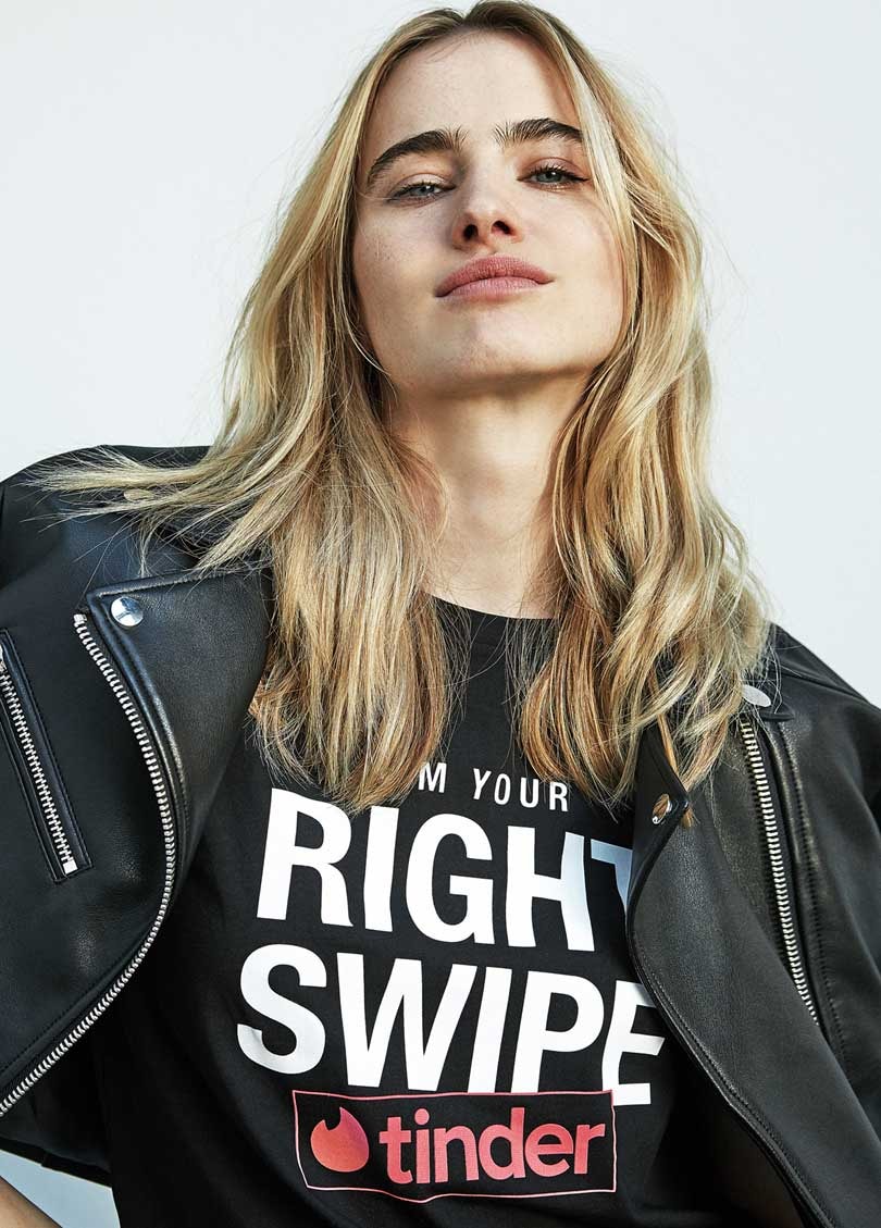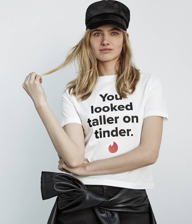 This marks the first time Tinder teams up with a fashion brand for a collaborative collection. The messages on the T-shirts vary from romantic (“Love Me”) to funny (“You Look Taller on Tinder”).