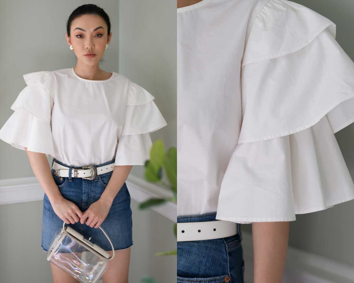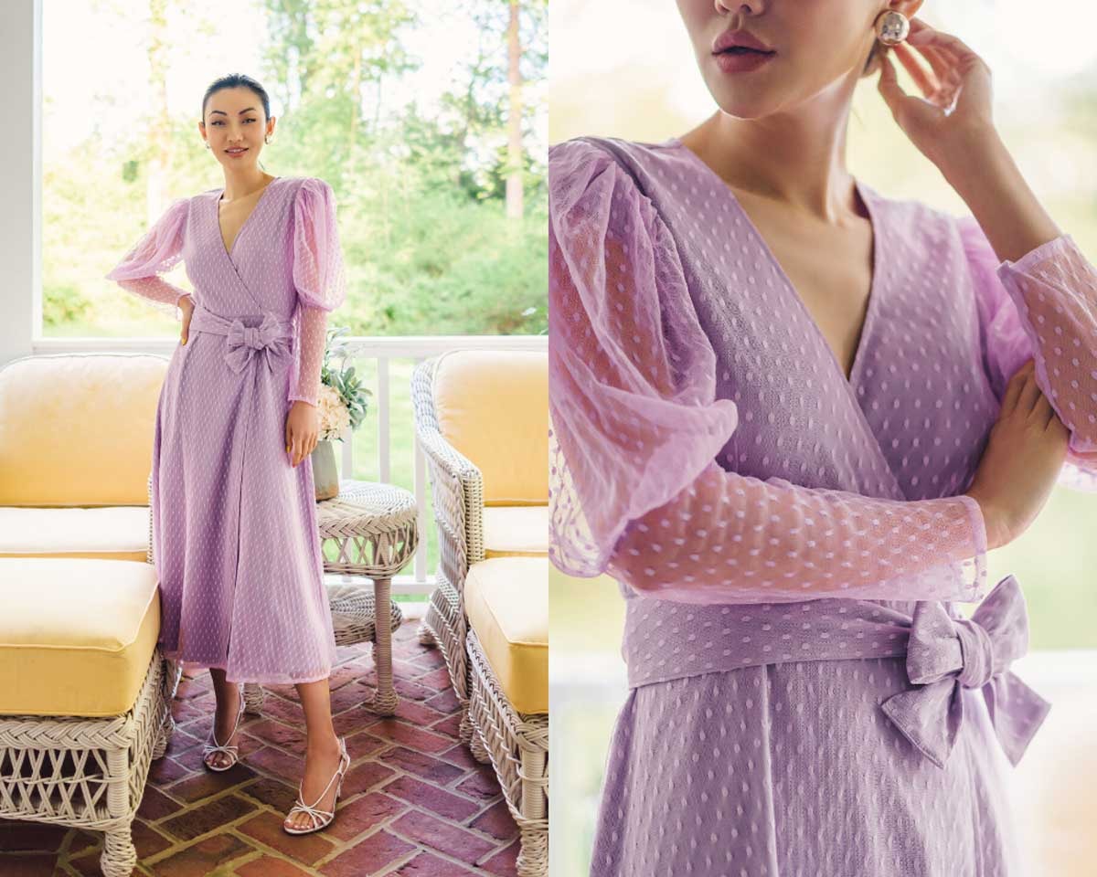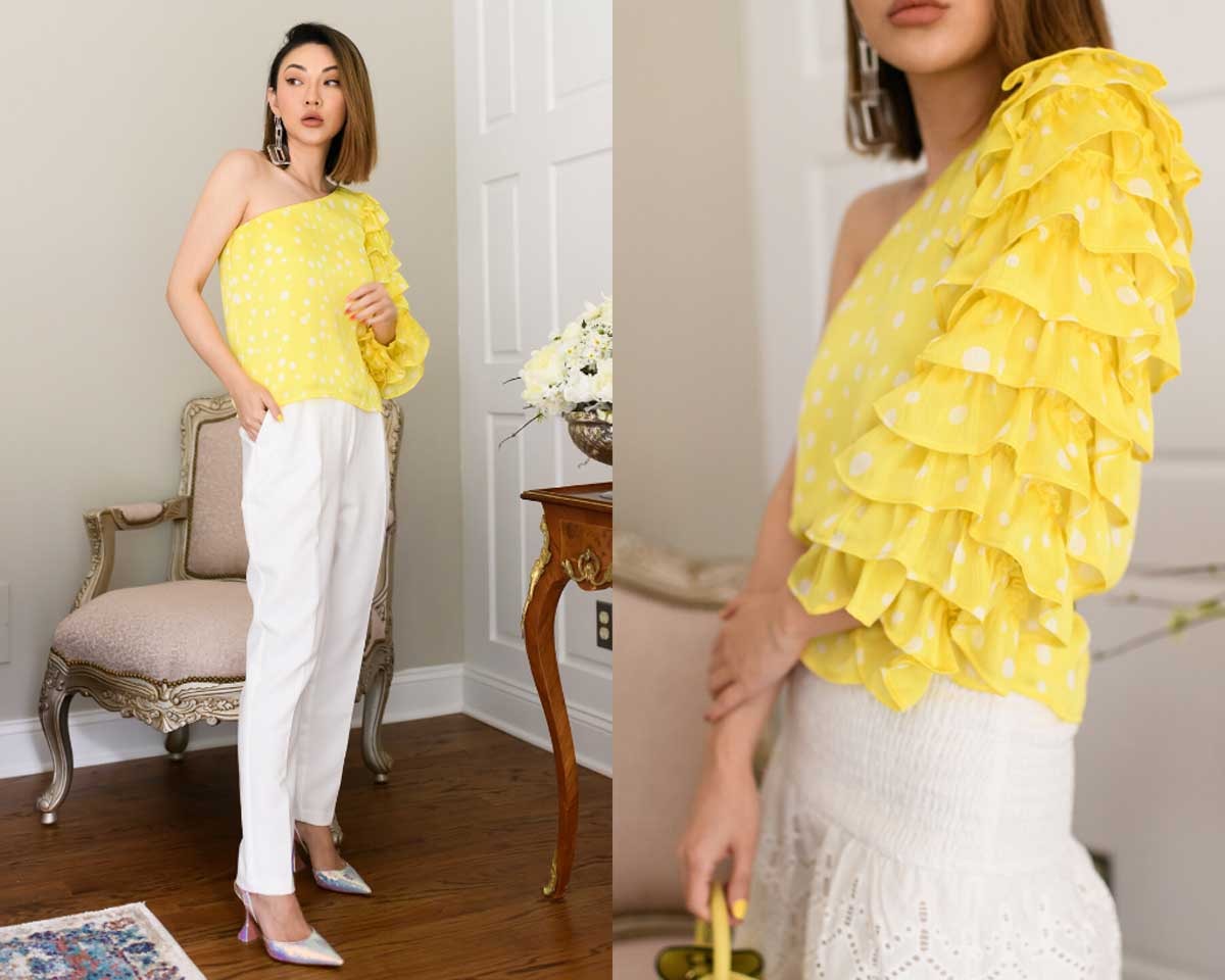 There are five pieces in the collection, all priced under 65 pounds, and includes a purple wrap dress with puffed shoulders and sheer sleeves, an off-the-shoulder puff sleeve blouse, a yellow one-shoulder yellow blouse with voluminous ruffled sleeve, a yellow feminine dress, and a white ruffle sleeve top.