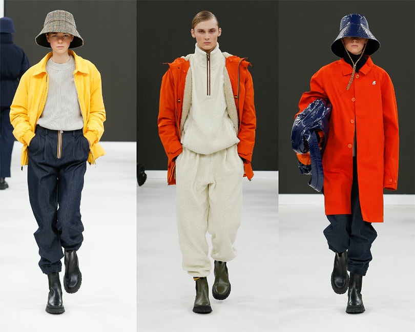 The iconic K-Way yellow-orange-blue tape wasn’t just showcased on the zip, the stripes appeared as statement features across padded jackets, bags, knitwear and scarves, for both men and women.
